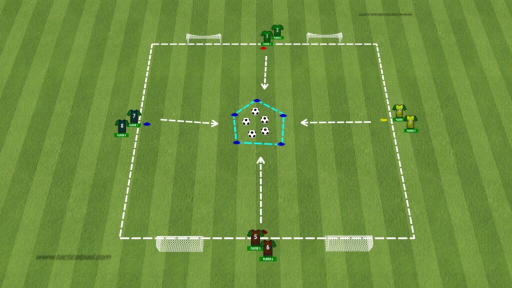 Sätt upp spelytan enligt skissen. Gör 4 lag i olika färger. Lägg bollar i ytan i mitten. Övningen startar med att tränaren ropar ut antal färger (2-4 st). Färgen som ropas ut först springer och hämtar en boll i mitten. Övriga färger försvarar. Så fort spelaren med bollen lämnar ytan i mitten får övriga spelare attackera och försöka ta bollen. Spelaren med bollen ska dribbla och försöka göra mål i valfritt mål. Om en försvarare vinner bollen får denna göra mål i något av de fyra målen.